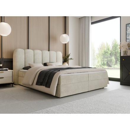 Najbardziej wyróżniającym elementem modelu jest tapicerowany zagłówek z głębokimi, pionowymi wciągami, które tworzą efekt miękkich, wyraźnie zaznaczonych podziałów. Ten dekoracyjny detal nadaje łóżku eleganckiej dynamiki i wizualnej miękkości, jednocześnie podkreślając jego nowoczesny charakter. Głębokie wciągi sprawiają, że zagłówek prezentuje się niezwykle stylowo i wprowadza do wnętrza przytulną atmosferę.