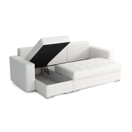 W narożniku Alex znajdują się dwa obszerne schowki na pościel, ukryte pod siedziskami. To doskonałe rozwiązanie dla osób ceniących porządek i wygodę – pomieszczą komplet pościeli, koce, poduszki czy inne tekstylia, eliminując konieczność przechowywania ich w innych częściach domu.