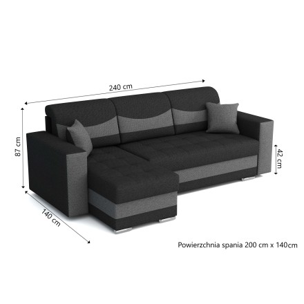 Model Alex został wyposażony w funkcję spania o powierzchni 200 × 140 cm. Dzięki sprężynom bonellowym zastosowanym nie tylko w siedzisku, ale także w oparciu, narożnik po rozłożeniu zapewnia jednolitą i sprężystą przestrzeń do wypoczynku – zarówno okazjonalnego, jak i codziennego. To komfort porównywalny z tradycyjnym łóżkiem.