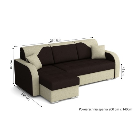 Lopez posiada funkcję spania o wymiarach 200 × 140 cm, opartą na sprężynach bonellowych nie tylko w siedzisku, ale również w oparciu. Dzięki temu, po rozłożeniu narożnika, uzyskujemy równą, sprężystą i stabilną powierzchnię do snu – idealną zarówno na okazjonalne wizyty gości, jak i codzienny wypoczynek.