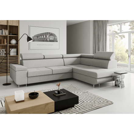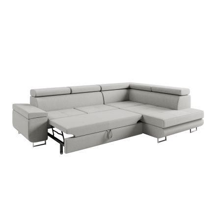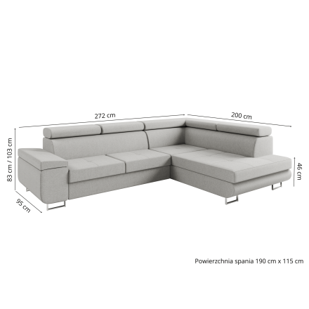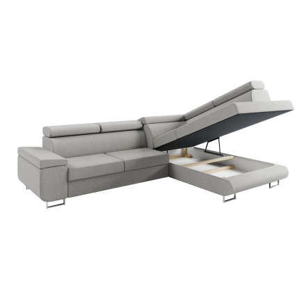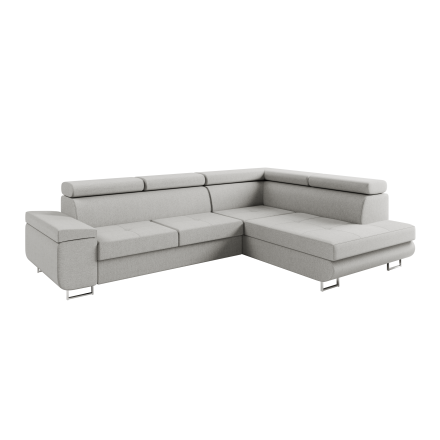 Szerokie, wygodne siedziska oraz miękkie oparcie zapewniają doskonałe warunki do codziennego wypoczynku. Trzy regulowane zagłówki pozwalają indywidualnie dopasować kąt podparcia, gwarantując komfort zarówno podczas relaksu, jak i oglądania telewizji. Smukłe, metalowe nóżki nadają narożnikowi nowoczesnego charakteru i optycznej lekkości.